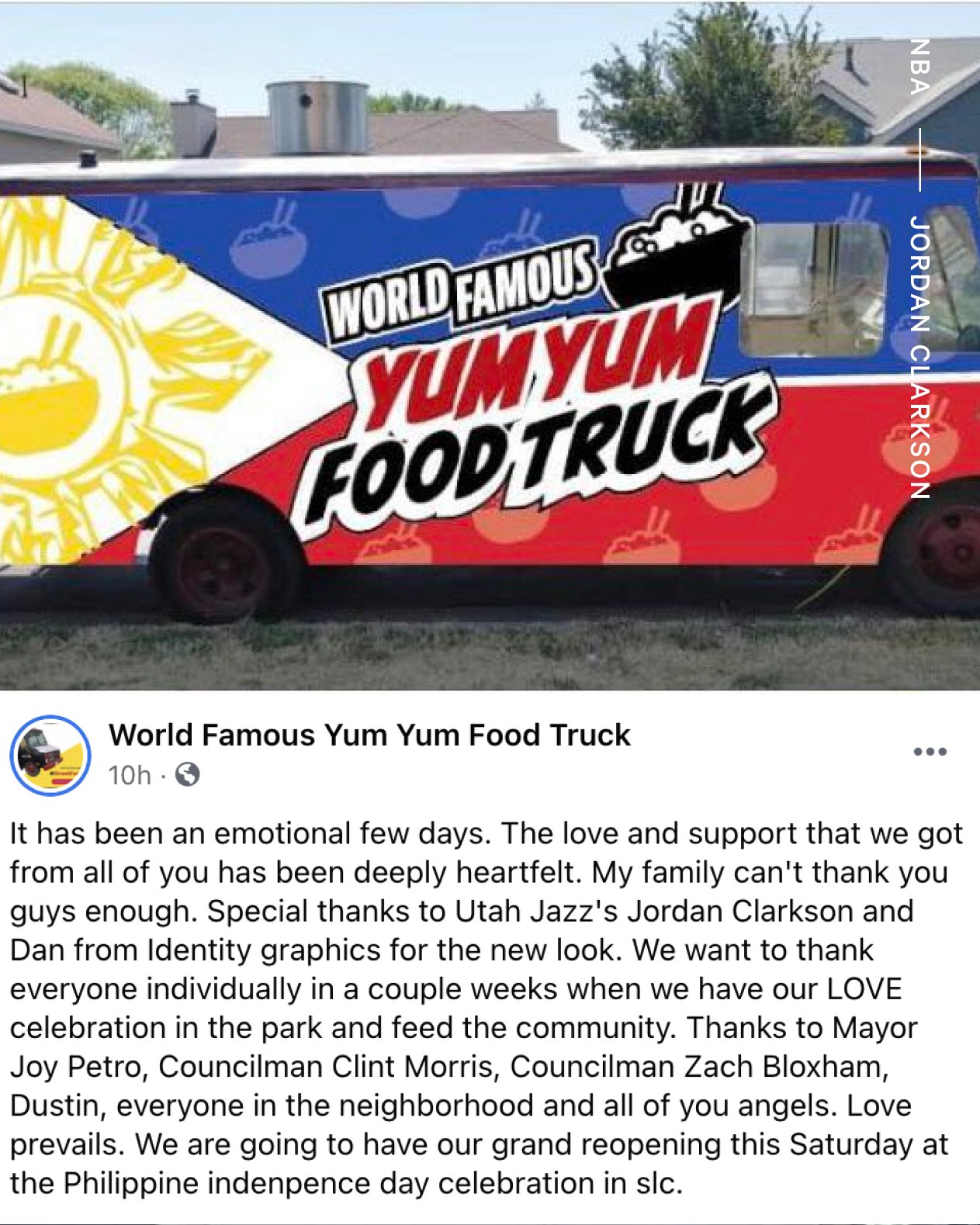 When Dan Workman a Layton resident and owner of Identity Graphx in Salt Lake City heard about the vandalism he offered to give the Yum Yum truck a custom vehicle wrap worth about 5000. A Filipino and Asian fusion food truck in Utah that was vandalized with racist graffiti over the weekend has been redesigned with the help of the local community and NBA star Jordan Clarkson. LAYTON Utah June 9 2021 Gephardt Daily A Utah food truck has been given a new look with the help of Jazz player Jordan Clarkson after it was vandalized with hate speech.